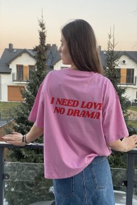 Damska koszulka oversize w kolorze różowym z napisem „I Need Love No Drama”.